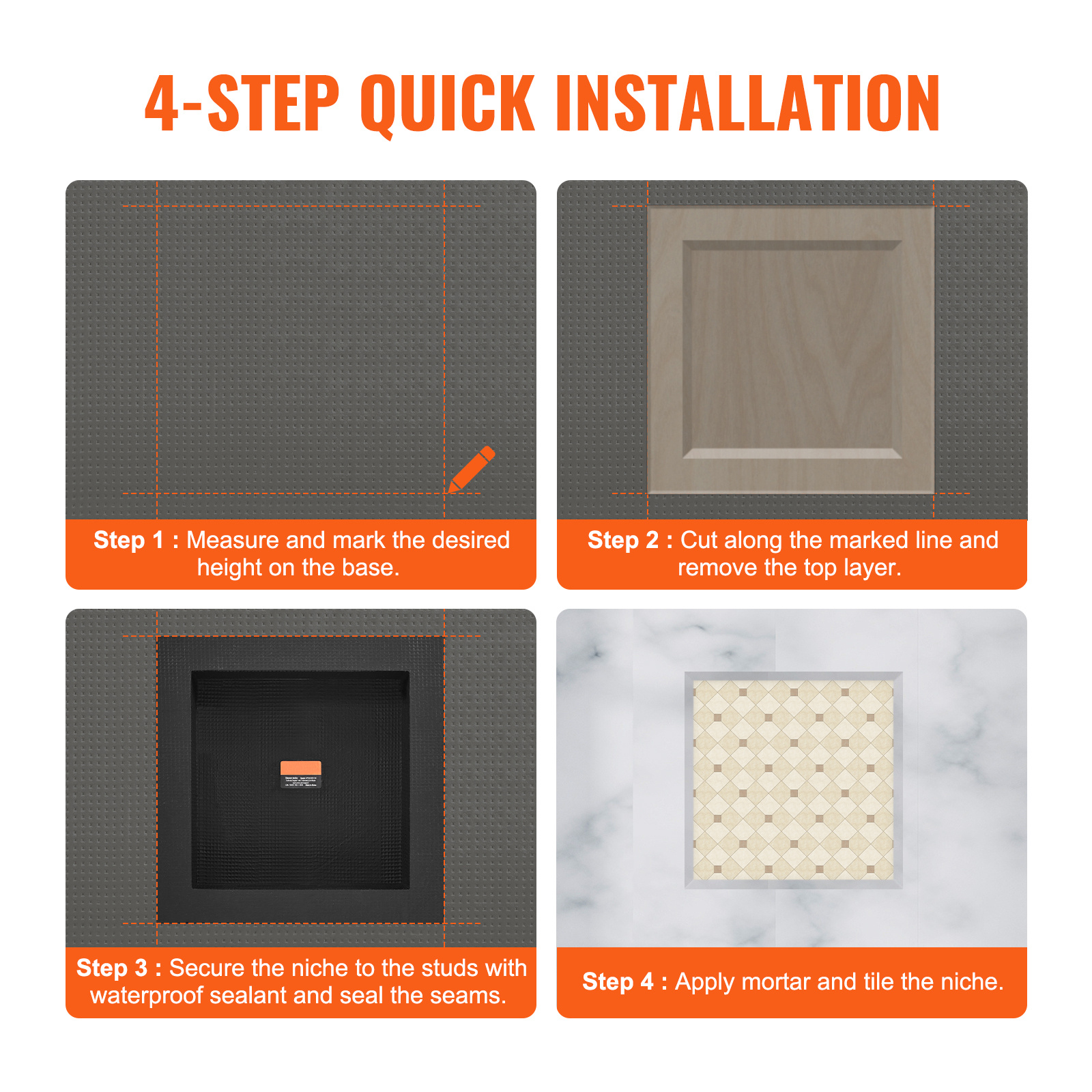 Easy Installation: Equipped with a complimentary installation kit, horizontal or vertical embedded installation, you only need to follow the following steps to complete. These shower niche shelves can be installed without complicated procedures.